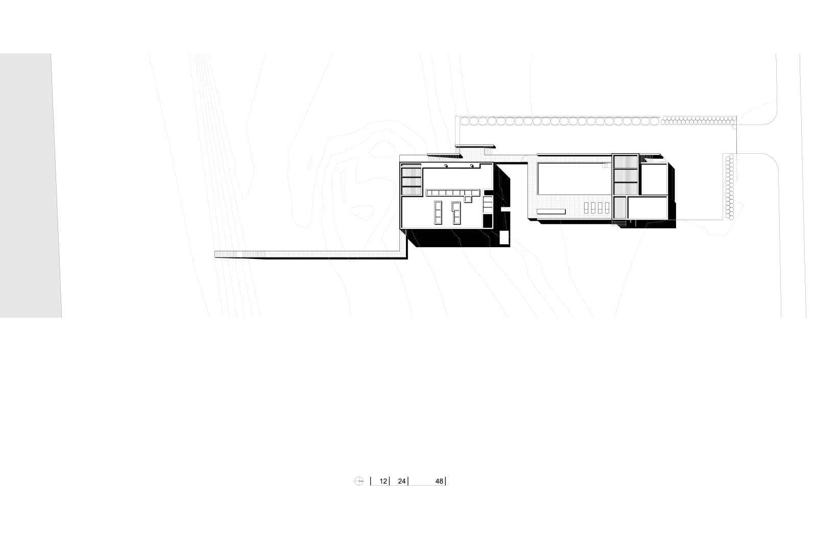 The progression through the site begins with a set of steps that lead up to the pool house. Ascending these stairs reveals dramatic views of the bay; continuing south along the main circulation walkway leads to a bridge connecting to the main house at the entry level and opening onto a glass vestibule. The second floor is accessed through a vertically contained grand stair that is animated with natural light by a continuous vertical louvered slot and skylight above. This level contains the main domestic spaces, including two bedrooms, a kitchen, a dining area, and a double-height living room, while the upper level houses another bedroom and the master bedroom, along with its bathroom and wardrobe. All areas of the house open up to exterior decks with a system of folding and sliding doors that bring light and breeze from the ocean, blurring the divisions between the architecture and the nature around the site.