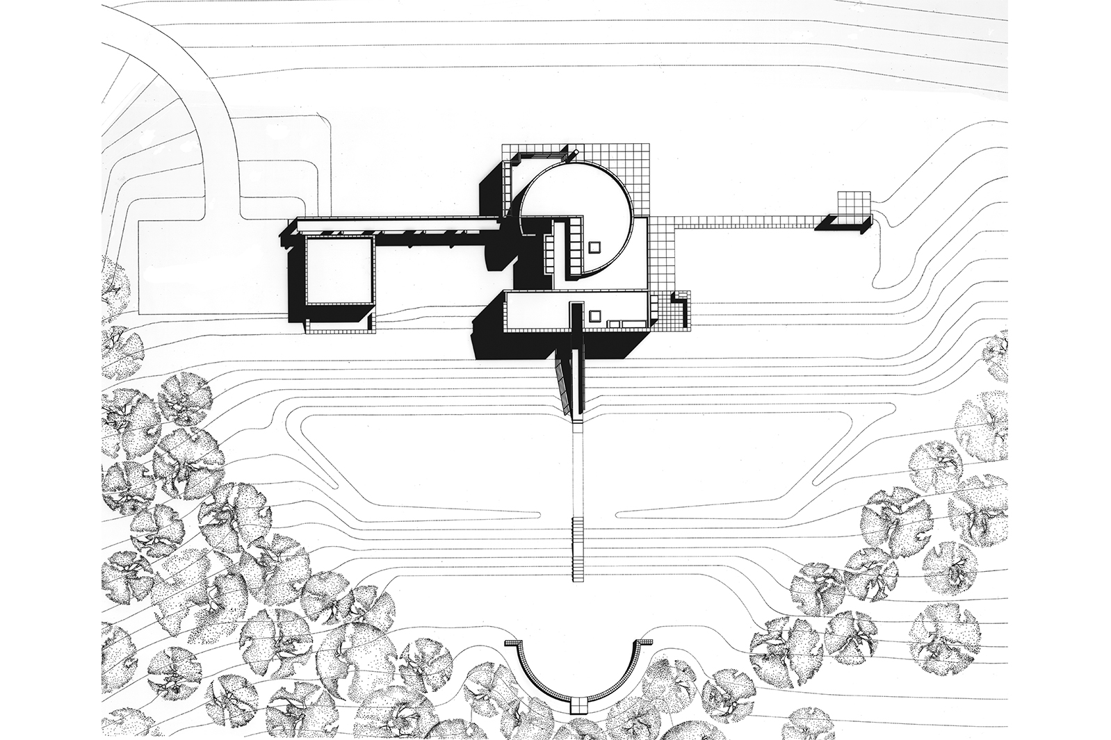 Sited near the top of a seven-acre sloped clearing framed by forest, this house was designed for a couple that collects native crafts. The interior balances spaces for the display of their collection with spaces with spectacular views to the landscape. The geometry of the design creates two perpendicular axes extending outward from the center of the house, thereby linking the interior volumes into the landscape and according the house a locus within the open expanse of the site.
