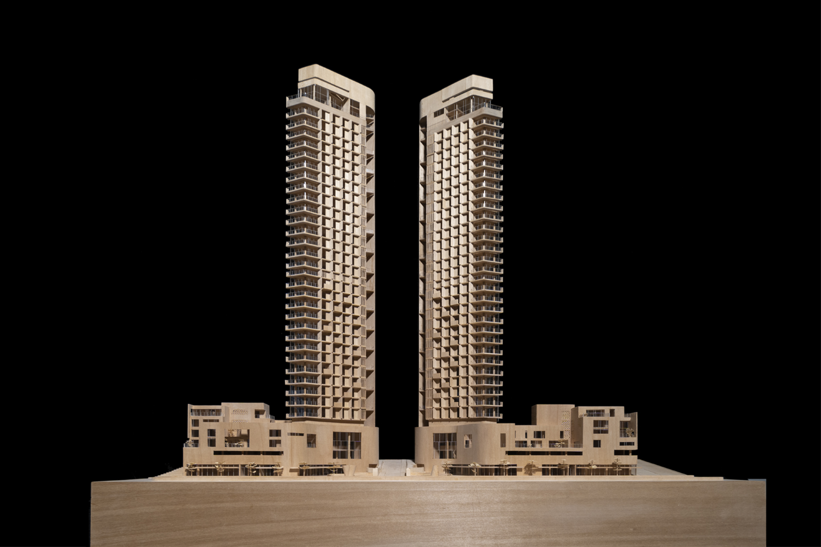 Each of the two luxurious Residential towers are comprised of twenty-eight full-floor apartments and one two-level penthouse. At the lobby level, a soft and subtle palette of colors and textures have been curated for a bright and airy entry, while a sculptural stair connects to a double height mezzanine area that functions as a flexible space with an extensive open-air terrace. The residences include four bedrooms each, with apartment layouts designed to optimize views and maximize diffuse natural light while maintaining privacy. Features include garden spaces, terraces, double height environments and panoramic views.