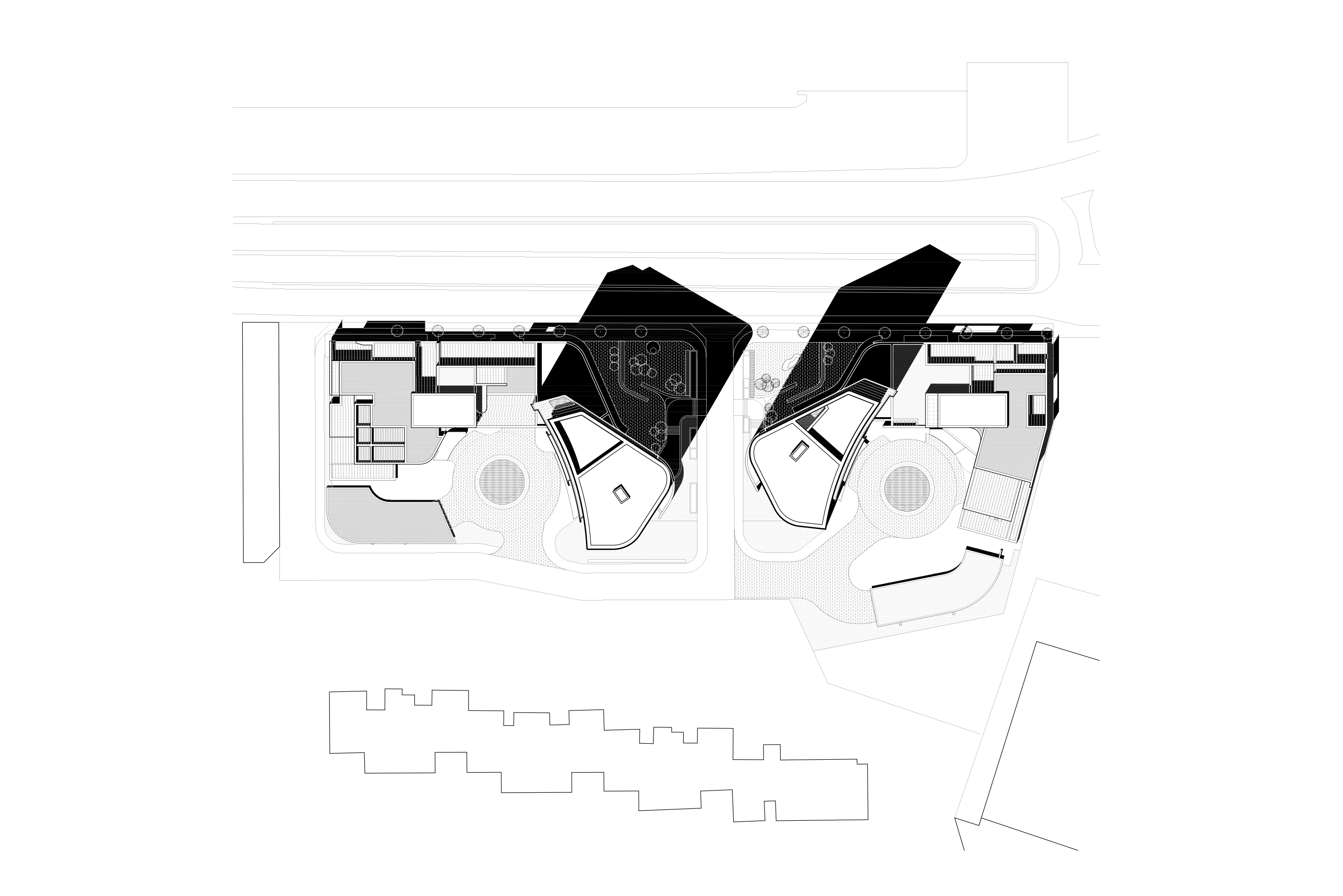 The Officetel concept at the base contains a total of 15 detached unique residences with generous outdoor terrace gardens for each unit allowing for generous access to light and fresh air. In order to create a symbiotic contrast with the towers, these residential volumes at the base are clad in an elongated light-colored brick. The shared amenity spaces located below the residential towers and the Officetel come alive through an engaging program with tactile spaces and materials. Skylights strategically located provide a dramatic source of light to the communal areas, especially the pool. These amenities areas revolve around wellness, health, dining and culture. The facade composition of solid walls, frames, screens, curtainwall, terraces and courtyards responds to the unit layouts, environmental and urban context and views. Defined by layering and materiality, the details of these various components give the facade color, depth, texture, and movement in the natural daylight. Enhanced light quality is also made available to occupants through increased facade transparency and an abundance of diffused daylight. The facade is made up of both a curtain wall and a window wall system and both systems will include operable windows integrated into the design, prioritizing not only natural light but also fresh air throughout.